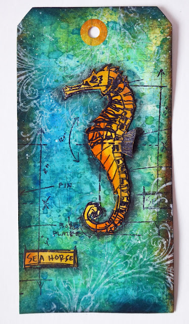 5) I further added to the background with more touches of orange and some extra stamping in both black and white. I painted a piece of card in yellow mixed with a touch of orange and stamped the star (Dina Wakley) onto it. I then roughly sponged on some 'neat' orange paint to add texture. I finished the ATC with the stamped word. You'll need to adhere the star with hot glue or gel glue as the background is very lumpy and bumpy.